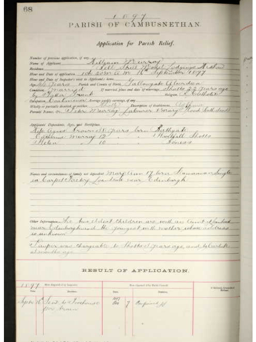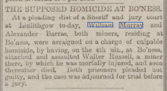 Whilst looking through the poor relief records for this family (there is a lot) I came across this find in William’s daughter’s records – “The father was involved in a murder at Bo’ness”