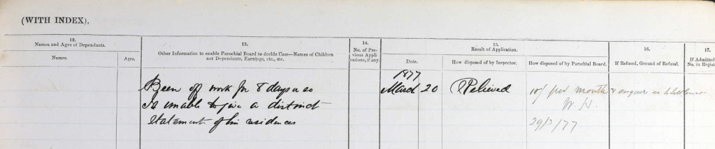 The records below are also from 1877, it’s an application that William made for poor relief when he was ill.
