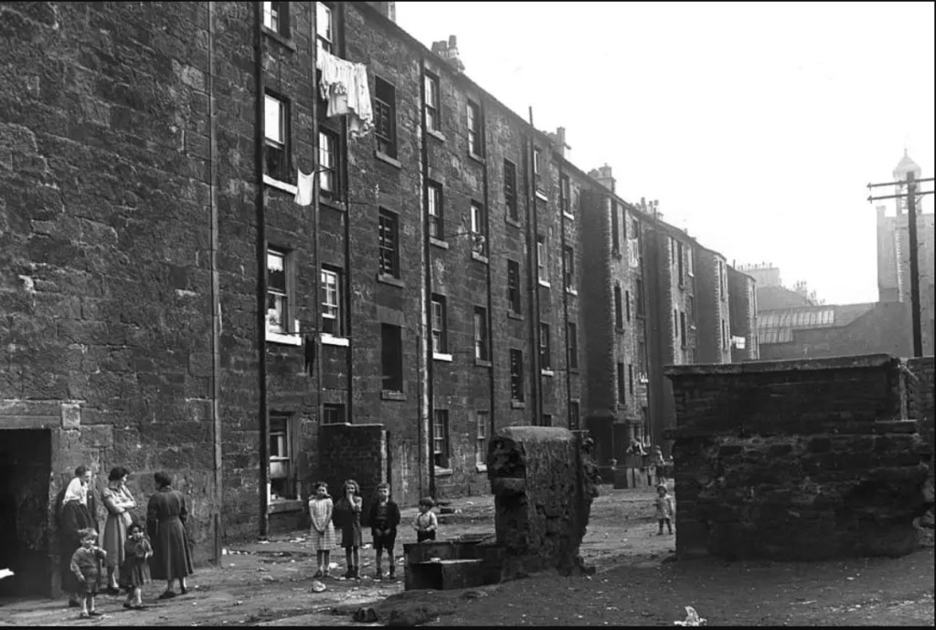 The Gorbals village hugged Main Street (renamed Gorbals Street) until the 1790s, but the area was soon transformed by the construction of huge numbers of factories and tenements. Waves of impoverished Highlanders, Irish, Jews and then Lithuanians arrived during the 19th century, and slums conditions prevailed for many. The Gorbals tenements were then built quickly and cheaply in the 1840s, providing housing for Glasgow’s burgeoning population of industrial workers. This is the type of building that John and his family were living in, and that James died in. (Photo below)