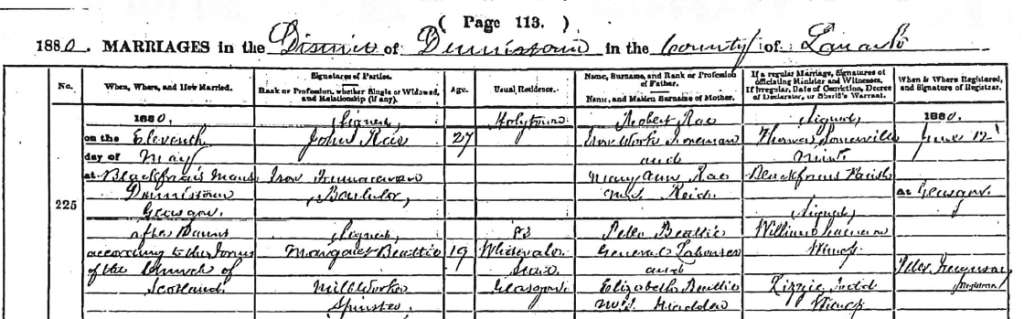 John was 27 when he married Margaret Beattie on 11th May 1880. They were married in the Manse (the residence of a clergyman, usually a Presbyterian minister). John had followed his fathers footsteps into the Iron Works and Margaret was a Mill Worker. Dennistoun is not far from the Gorbals but living conditions were definitely an improvement from his childhood.