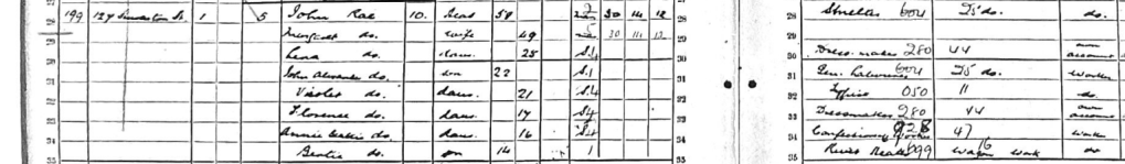 In the 1891 The family had moved to 101 East Nelson Street and had 6 children. By 1901 The family had moved again (no 2 records I have for this family are the same address) John was now 49 years old and they were living in Camlachie. Their family was complete with 11 children living at home – Elizabeth, Mary Ann, Lena, William, John, Violet, Margaret, Florence, Annie, Bartie and Josephine all aged between 20 years and 4 months.