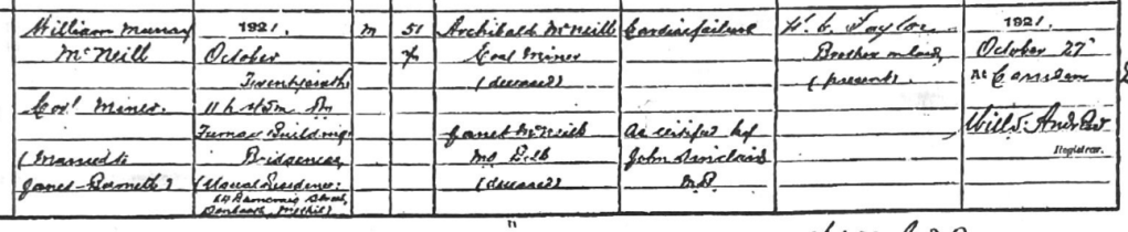 Sadly, 1921 is the last year there are records for William as he died due to heart failure at only 51, just 6 months after the census. He however didn’t die with his wife and children around him. He died where he had lived his whole life, back in Carriden. The 26th October 1921 was a Wednesday so it makes me believe he had returned to Grangepans for work and was living at his sister and brother and laws – not expecting to die!