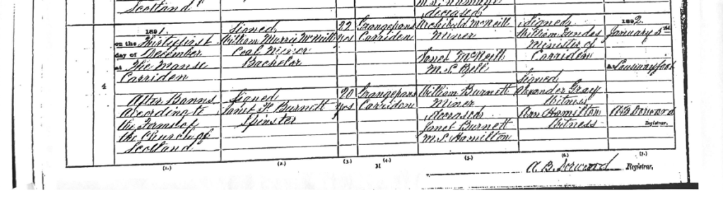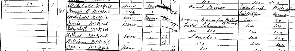 In 1881 they are in still in Carriden, and their address is double row, big house 4. I have checked the census record and they are the only family living in the house. His brother Archibald wasn’t a miner in this census, he was drawing income from interest. This leads you to believe they had money however his sisters Jessie and Elizabeth were both field labourer’s so this isn’t the case.