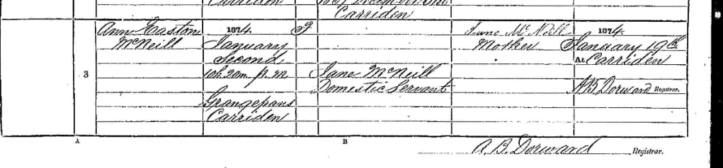Annie, the youngest sibling detailed above in the 1881, was 6 years younger than William, This would make Janet 51 when she gave birth to Annie. I investigated this further thinking it may have been one of the sister that had the baby out of wedlock. However Jane would only have been 11 years old at the time. As William’s father was from a large family I would be inclined to believe that he had taken on a niece’s child as his own. Annie was still living with them 10 years later, in the 1891 census, as their child. I have detailed the birth certificate below.