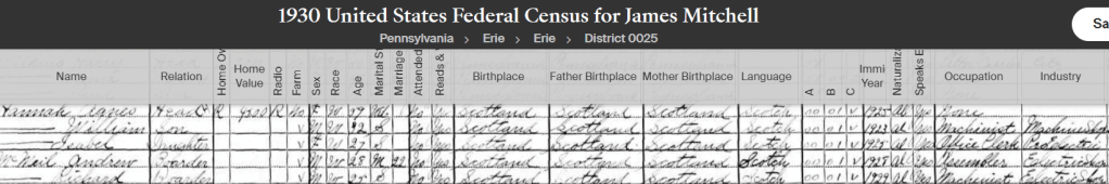 Many of Janet’s children settled close to her in either Buckhaven or Methil. Her daughters Janet, May and Annie all had their own families and lived in Buckhaven as did William. Jeannie and Archibald lived Methil with their families. Helen was the only one that stayed in Bo’ness and Andrew and Richard both emigrated to Pennsylvania. (The 1930 census below shows them living together). Most of the siblings travelled to the USA at some point to see their brother’s.