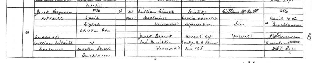 Janet lived to 84 years old, however in doing so she lived to see her daughter Jeannie die 1954. 84 is a fantastic age, however her sister Alison, who moved to Canada lived to 100! She was born August 1884 and died in September 1984. Janet died in Martin Street, Buckhaven – in a house the same as I grew up in. She was living with her daughter May Jack at the time.