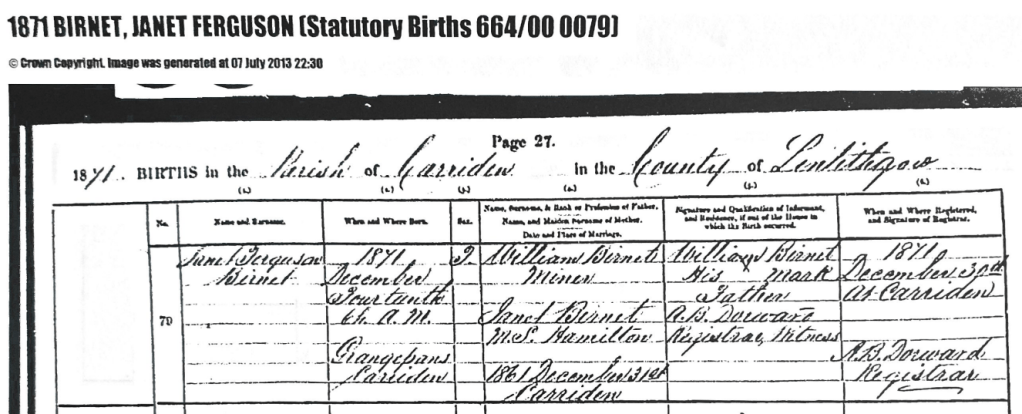 The first glimpse we have of Janet’s life she is a 9 year old scholar. Her father, William, was a coalminer. Her brother’s William (18) and Richard (16) were both Iron Moulders. Thomas (14) was a labourer in the local Iron Works. We could see from Janet’s birth certificate that her father couldn’t write his own name – this is very common for that generation of working class men. It could be the reason why Burnett is spelt differently too. They lived on Caddells land, This is land between Carriden and Kinnel (The Iron works were at Kinnel). It was owned by the Caddell family. They lived in Carriden House and owned a lot of the local land.