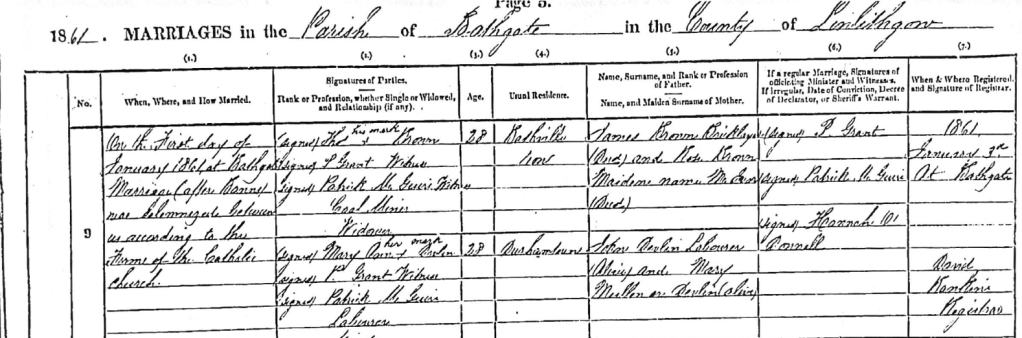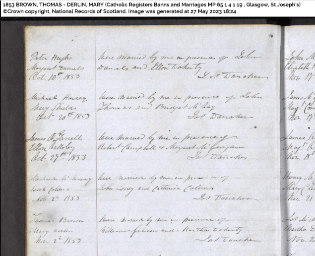 The first record I have for Thomas is when he marries his first wife Mary Devlin in St Joseph’s RC Church in Glasgow in 1853. Mary was 10 years older than Thomas and was already a widow when they married. She had 2 children from her first husband, Henry and Sarah McColgan.