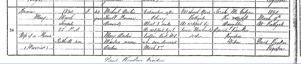 Thomas was married to Mary for 7 years and during which she gave him 2 children, Rosa and then a son, Thomas. Mary died at 40 years old – cause of death “exhaustion after delivery”. This was after the delivery of Thomas. Unfortunately Thomas also died, he only lived for 5 months. Thus leaving Thomas a widow in his 20’s, a young daughter Rosa and a step son Henry in his care.