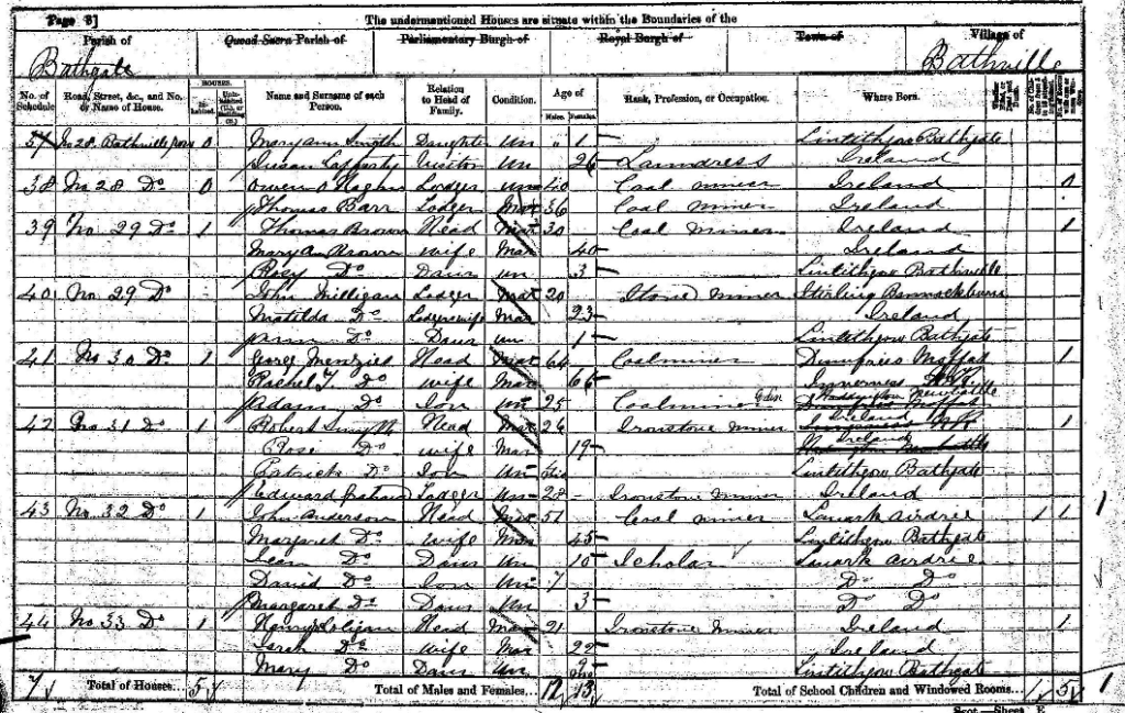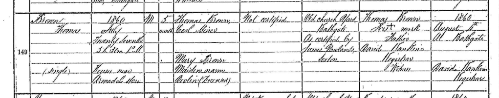 Thomas and Mary Ann had 3 children, Agnes, Mary Ann and Peter. All of their children were born in Bathville. However by 1871 the family had moved to Muldron Row in West Calder and Thomas was an Iron Stone Miner.