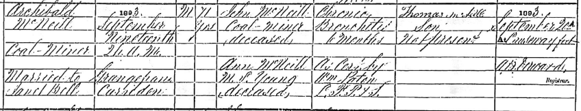 Archibald was one of at least 13 children and at the time of the 1841 census he was the eldest child living at home. Both his younger brother Thomas and himself were coal miners like their father.