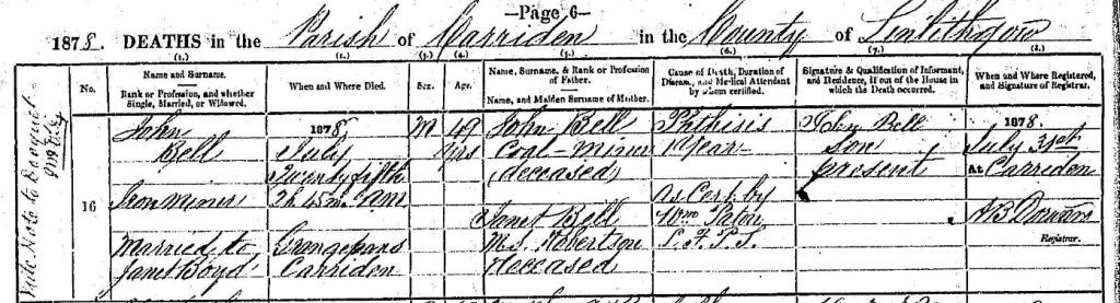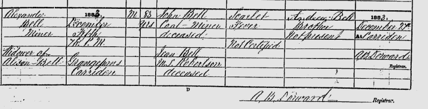 Janet’s eldest brother Alexander was a coalminer, he lived all his life in grangepans. He married and had 5 children. He lived until he was 63 years old and died of Scarlet Fever.
