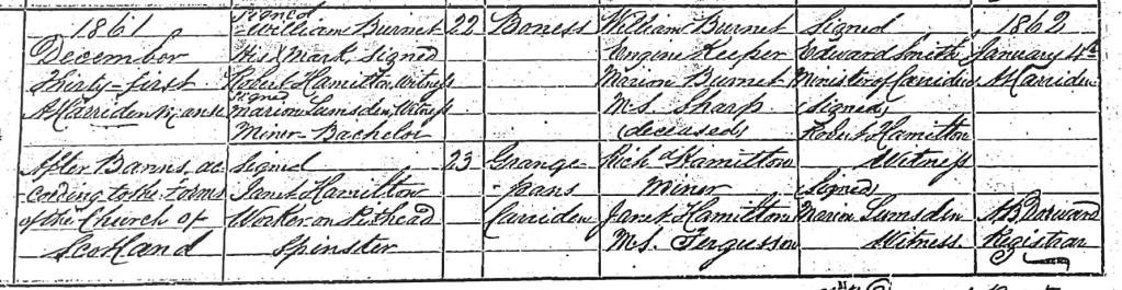 William married Janet Hamilton at Carriden Manse when he was 22 years old, only 6 months after the census record. The witnesses were Richard Hamilton (who become his brother in law and Marion Lumsden) . Sadly he had already lost his mother. William was illiterate however his wife was not.