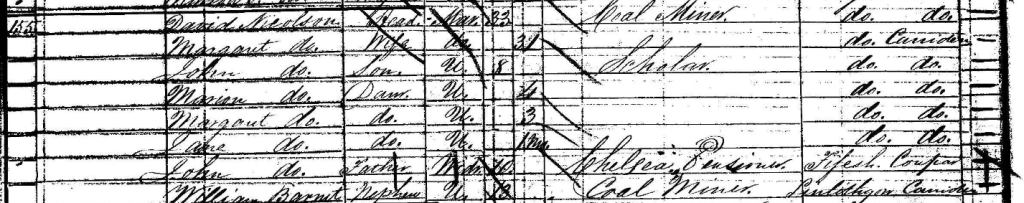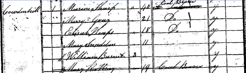 I can’t find a record of Wiliam’s birth although all the census records show he was born in linlithgowshire. By the 1841 census he is 3 years old and living with his mother and 3 other women and their children. His mother and the other women were all coal bearers. A coal bearer, is usually a woman or girl, who carried the coal either on their back or in baskets from the workings to the shaft, and in many cases up the shaft on ladders to the surface of the coal mine.