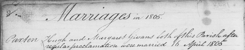 The next record I have is Hugh marrying Margaret Givans in 1805. This indicates they were both from Burntisland and were married in the church above. Other than the birth of his 3 children it is almost 20 years before the next record of him.