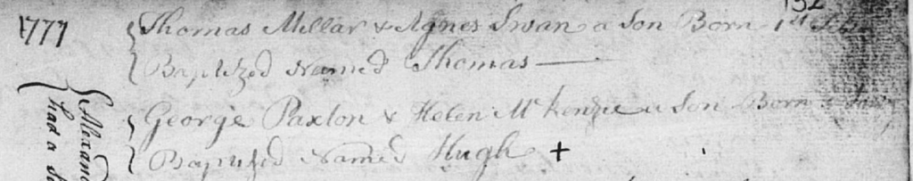Hugh Paxton was born and baptised in Burntisland to George Paxton and Helen McKenzie. His brother John followed in 1797 and Helen in 1782, then George followed in 1785 and again in 1791 leading us to believe that a child died in infancy.