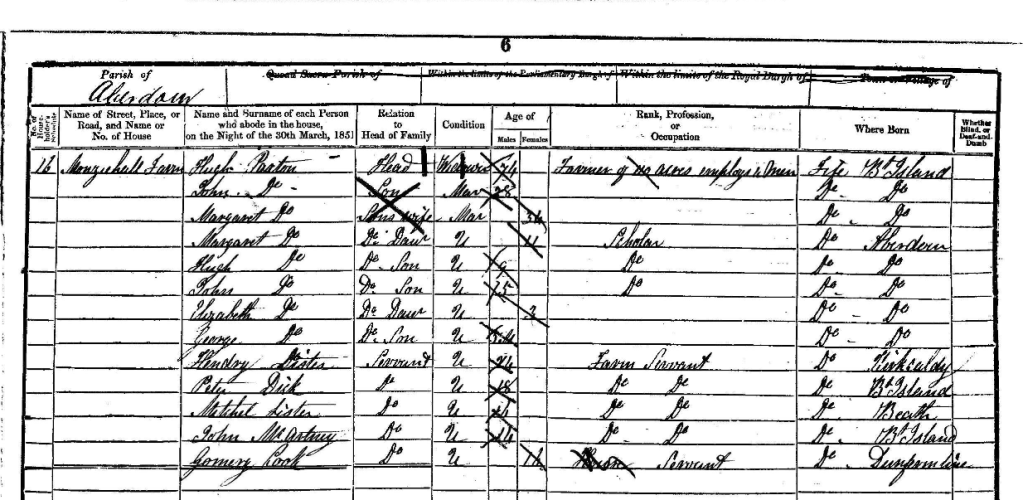 Below is a copy of the 1851 census, Hugh has a farm of 110 acres and employs 4 farm servants plus an another. I have also been to see this farm as it still there today – and lived in and worked on! I have taken a Birdseye view of what 110 acres looks like – the tree line to the road. This farm is between Crossgates and Aberdour. It is beautiful and looks as though some of the original buildings are still there.