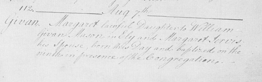 Margaret was the third child born to William Givan, a Mason and his wife Margaret Jervis. They had a large family and I have found the following birth records.