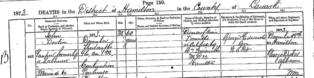 John lived the rest of his days in the country of Lanark. I haven’t been able to uncover John on any of the census records therefore the only record I have for him is his death certificate. The death certificate states disease of the brain. Medical knowledge now tells us this could have be many things but it is certain he could not look after himself, and thus ended up in the Poor House, like many of the Irish that came over during the famine.