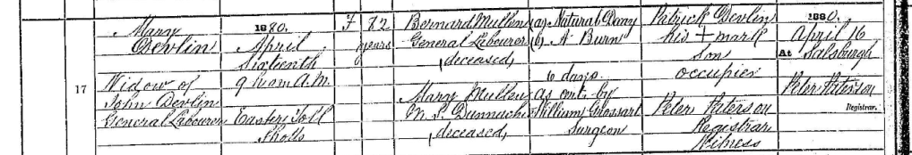 It was Mary’s son Patrick that signed her death certificate some 6 years later. she died on old age. Patrick signed the death certificate as occupier, Mary died in the house her son occupied.