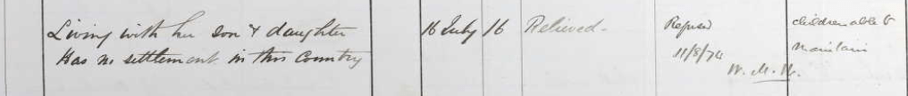 Poor records show that in 1874 Mary was living with her children (Patrick and Catherine, I believe) In Salsburgh, Shotts. she was wholly disabled due to old age and entirely dependant on her children. Her claim for support was declined as she had no settlement in the country and her children were able to look after her. (poor records below)