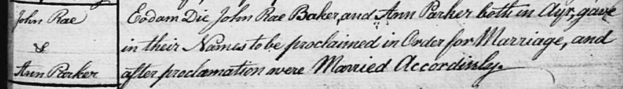 AS there were no census records in the 1700s the next record we have for John is his marriage certificate, he married Anne Parker on 1st September 1790 in Ayr. (Note that at the beginning of the extract the phrase “eodem die” is used, a latin phase which means the same day. ie they were married the same day as the couple above.)