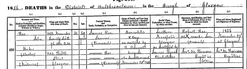 John was aged 69 and died of Bronchitis, he was a master baker when he died. His death certificate states he is buried in the Southern Necropolis cemetery in Glasgow.