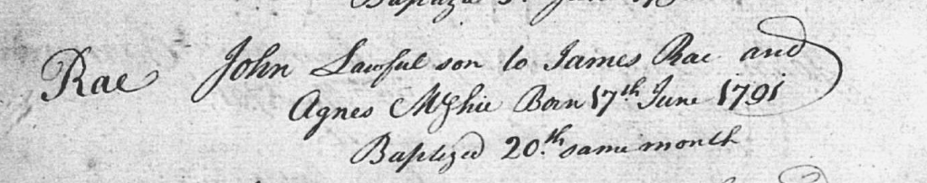John was born in Lanark on the 17th June 1791 to James Rae and Agnes McGhie he was one of 7 children – Agnes, Helen, John, James, Allen, Robert & Janet. Out of all his siblings I only found records of his sister Helen, who married a Blacksmith.