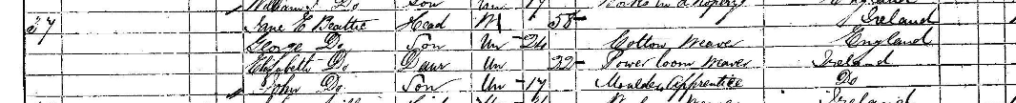 By the 1861 census Jane Ellen is a widow, living in Scotland, with 3 of her children – George, a cotton weavers, Elizabeth a Power Loom Weavers and John an apprentice. They were living in Bridgeton. A town that started as a small weaving village in 1705. However, not much interest was shown in the town until 1776 when Rutherglen Bridge was built over the River Clyde and the area became known as Bridge Town (or Brig Toun in Scots). The area was incorporated into the city of Glasgow officially in 1846.
