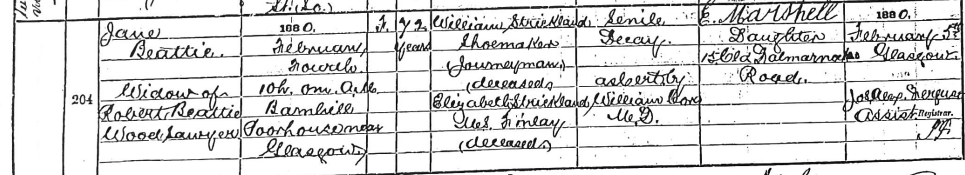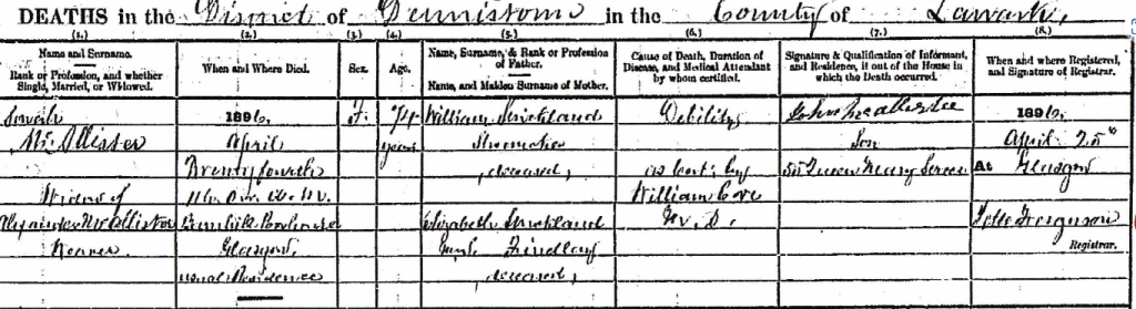 Jane Ellen died in 1880, and like many of the others of her time she died in the poorhouse. She was one of the lucky ones as she lived until she was 72 and her daughter was there wither her. Her daughter Eliabsth, also lived on Dalmarnock Road.