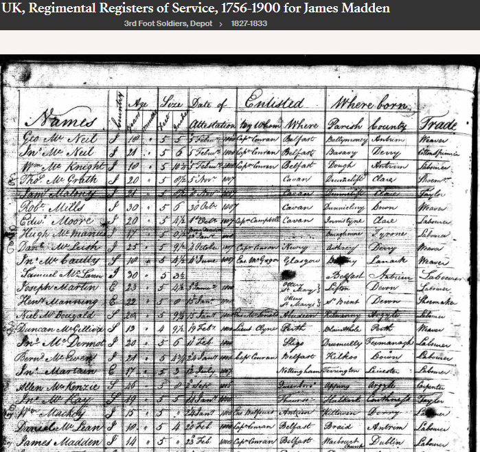 James’s father, also James Madden was a soldier from Ireland – He was from Dublin and signed up to fight for the British Army in Belfast in 1807. He was only 14 and didn’t even need to lie about his age to join the army, in the late 1700s they recruited from the age of 14.