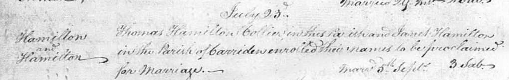 Another indication of how close all their lives were knitted together back then is the lives is siblings led. His sister Janet Hamilton married a Thomas Hamilton (another Hamilton) and stayed in Carriden, she lived until she was 75 years old. In 1851 her mother was living with her – aged 68 at the time.