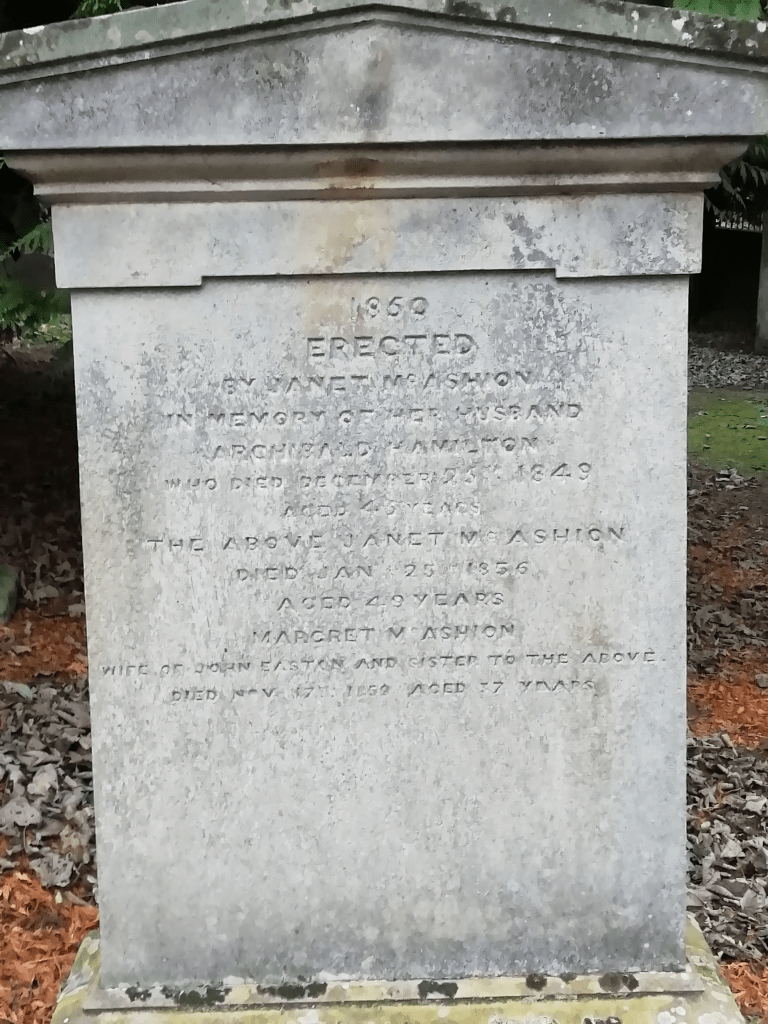 His brother Archibald married Janet McAshion in 1828, they were married 20 years. His wife Janet put this gravestone up. They didn’t have any children and lived their life in Carriden.