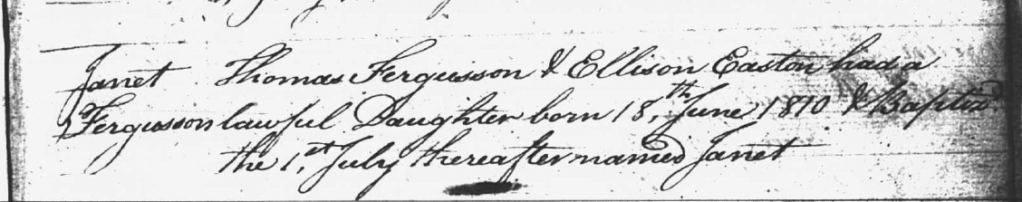 Janet was born on 18th June 1810 to Thomas Fergusson and Ellison (later known as Alison) Easton in Carriden. Her father was a miner. It’s definitely fitting for the last person from this generation to be a miner!