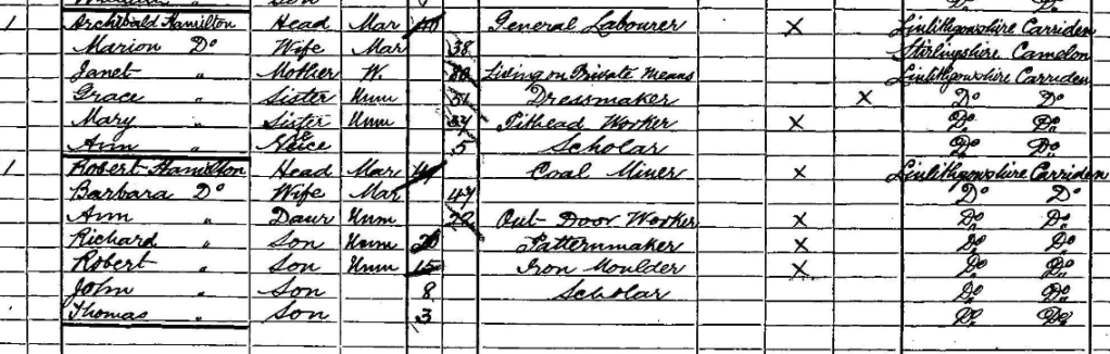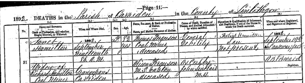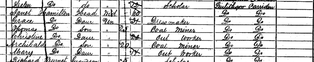 Her sister Alison Ferguson and William Robertson “enrolled their names…in order to marriage” on Aug. 16th, 1834. In fact, the marriage never took place due to “ the Bride having been killed in a coal pit on the 23 inst.” Old Parish Register. Her sister Grace married Peter Sharpe and had at least 6 children, she was one of the few who moved away, she lived her life in Bathgate. Thomas married Christian Pettigrew, they didn’t have any children of their own however their niece Helen Pettigrew lived with them, Thomas died aged only 56. The only records I have of her sister Mary is her working as a coal bearer at 16 and of her brother Archibald a coal cutter at 12!