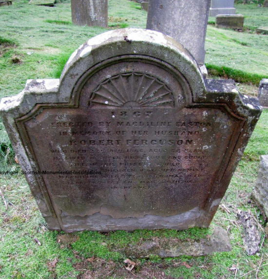 Robert was the eldest born in 1808 He died in 1866 and his gravestone was erected by Magdiline Easton (his wife) in Memory of Her Husband Robert Ferguson D. 22.12.1866 Aged 58y He Lived A Sober Righteous and Godly Life in This Present World. Also Their Children Who D. Namely Magdiline Aged 9y. Thomas Aged 5y. Robert and Mary Both D. in Infancy