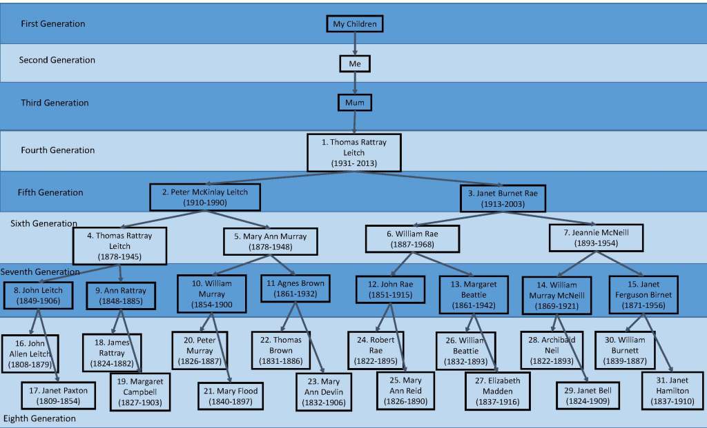 As you can see this tree goes up to person no. 31 (Janet Hamilton – she is my great gran’s – great gran) and this will take me over the half way point. This also shows there are 16 people in the 8th Generation and therefore there will be 32 people in the 9th Generation. I have at least one piece of information on every person, and therefore a story (I hope) for each of them! This takes me to 63 weeks…..we can then go onto 10 generations and beyond.