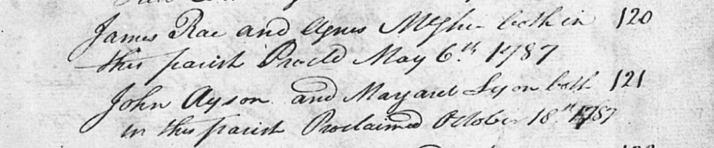 James Rae is where we begin. He married Agnes Mcghie in Glasgow, Lanarkshire, on 20 May 1787 (Glasgow didn’t become a separate lieutenancy until 1893) They had 7 children. The marriage certificate shows that over a 5 months period there was only 2 weddings in this parish. In that year – 1787 there was only 14 wedding in total in the parish.