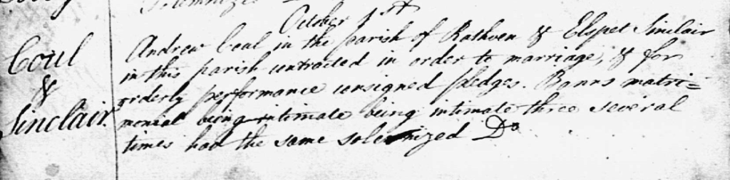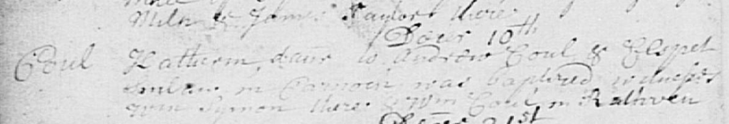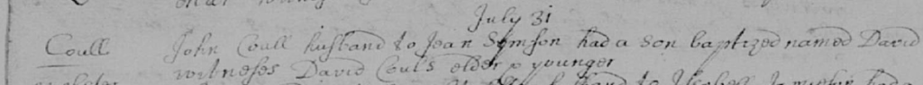 The birth certificate above shows that Katherine’s parents were Andrew Coul and Elspet Sinclair and the certificate below shows Andrew’s parents. That is only 2 certificates that link 3 generations (A gem of a find from 300 years ago!)