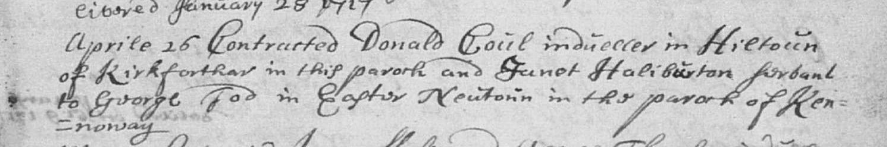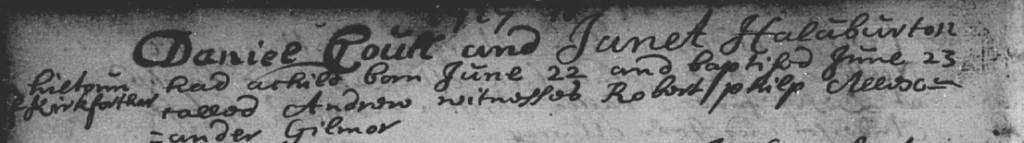Daniel was born on 31 July 1698 in Brechin, he married Janet in Markinch, Fife on 26th April 1716. Janet was born in Coupar Angus on 9th Feb 1696 as was her older brother William, however, Janet’s siblings Jean and Isobel were born in Brechin. This is the most likely way Daniel and Janet met before they moved and married in Fife.