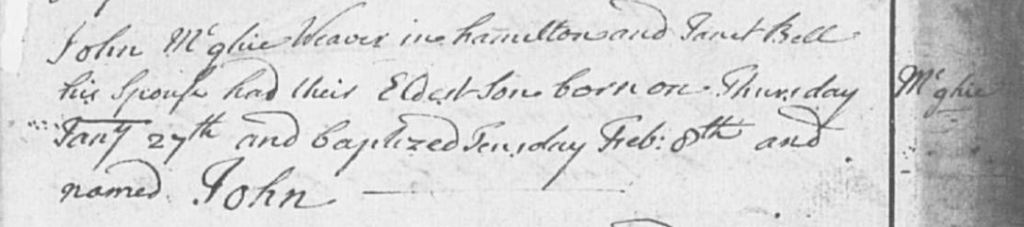 John McGhie was baptised on 8th February 1743 in Hamilton he married Katherine when was he was 18 years old on 31st December 1761. Records show Katherine was born in 10th December 1742 in Rathven, Banffshire.