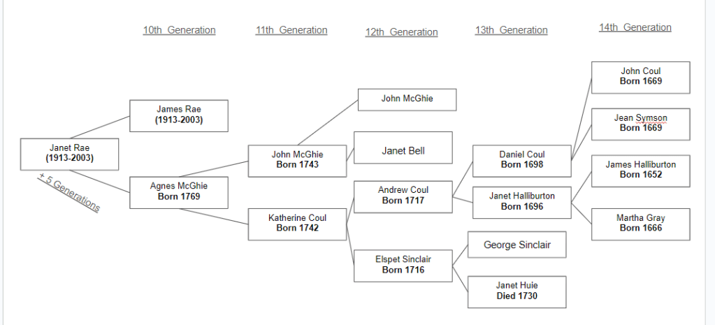 Unfortunately I can’t confirm any further information past the 10th Generation for James Rae, John Parker and Mary Henderson and the rest of this page is information I have found on James Rae’s wife, Agnes McGhie heritage.