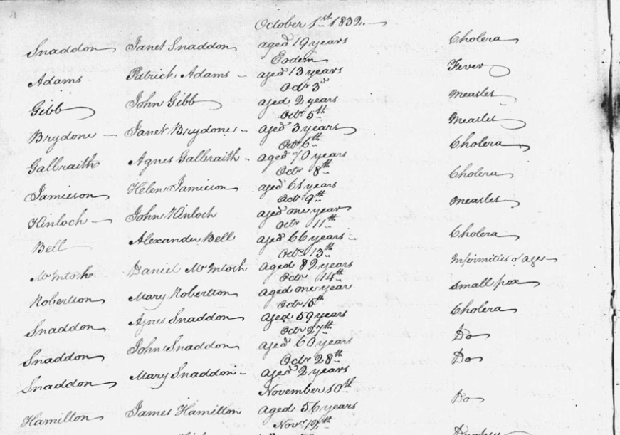 I have copied the full page of registered deaths above. As you can see many died of Cholera in this one month. This occurred during the second cholera pandemic (1826–1837). It reached from India across Western Asia to Europe and Great Britain. The pandemic also spread to the Americas, as well as east to China and Japan. Cholera caused more deaths than any other epidemic disease in the 19th century.