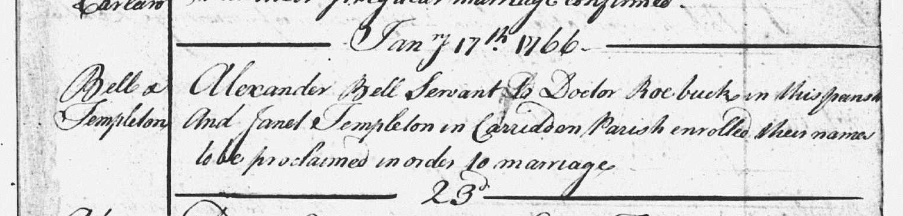 This marriage certificate shows Alexander was a servant to Doctor Roebuck (mentioned above). Dr. Roebuck had moved to Kinneil House in Bo’ness only 2 years prior.