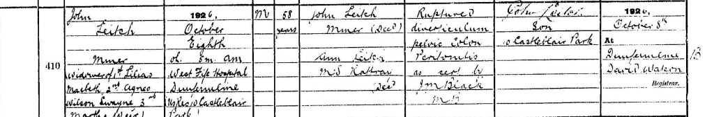 Her son James also lived in Methil, he was a coal miner and lived until 70 years old. His son (another John Leitch) lived in Simon Crescent in 1944! Along the road from William and Jeannie Rae! He died at the Royal Infirmary in Edinburgh of Heart Failure. Her daughter Ann lived until 1950 aged 67 but also died at the Royal infirmary due to Heart Failure.