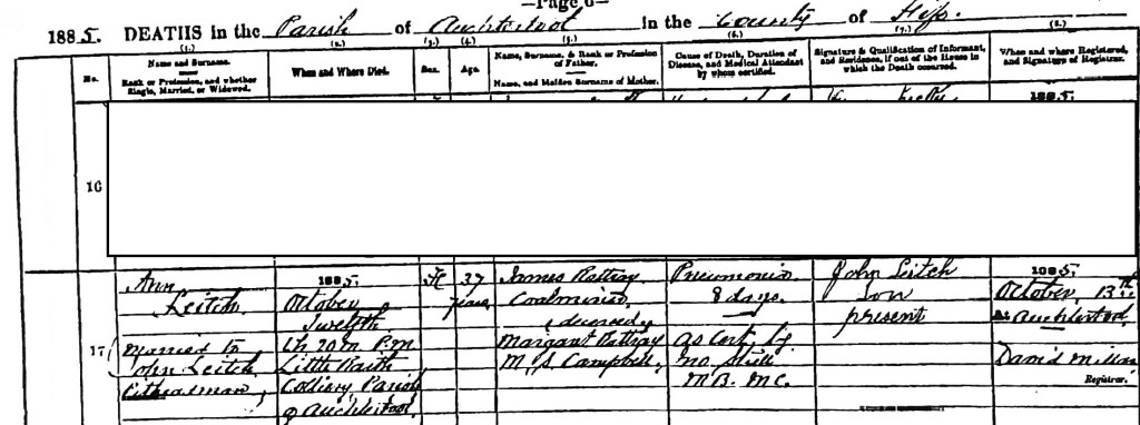 Ann gave birth to another 2 children before she died in 1885 after having Pneumonia for 8 days, it was her son that signed the death certificate – he was only 16/17 years old at the time. Why wouldn’t it be her husband? As They are working in the Little Raith Colliery, Auchtertool at the time was it so he didn’t have to take time off work?