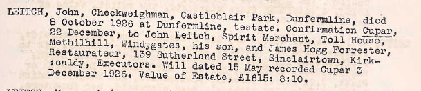 What I found fascinating when researching Ann’s eldest son John was that when he died in 1926 he left a will and that is states he left his estate valuing £1615 (£78,125 in today’s money) to his son John – A Spirit Merchant!! If you look back to Ann’s son, Thomas Rattray Leitch, he had the Steamboat Tavern in 1926 and her other son James had the East Dock bar. If you know Methil you will know how close all these bars are and they were owned by Leitch’s!!