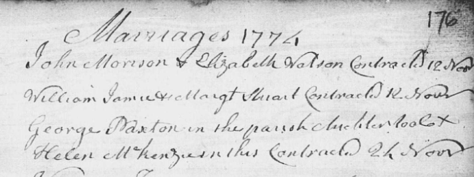 George married Helen McKenzie in Burntisland on 24th November 1774, the marriage certificate states that Hugh was from the Auchtertool parish at this time. I believe his father owned land there. They had 4 children that lived into adulthood, all of them were baptised in Burntisland. Helen, Hugh’s wife, was born in 1744 and was 11 years older than George.