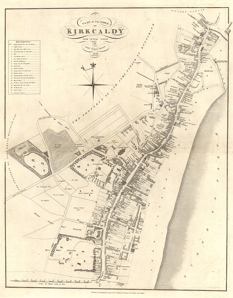 George was born in Kirkcaldy in 1755 and lived in the neighbouring villages of Auchtertool and Burntisland all of his life. The map below depicts Kirkcaldy in 1824, it is how Kirkcaldy would have been in his life, It show’s how small the Lang Toun was, it mainly stretched along the water front. The boundaries lies for Dysart and Dunniker. In the 16th and 17th centuries the high street was less than 1 mile long, by 1876 in was 4 miles long. The town only gained its independence from Abbey rule (Dunfermline) when it was created into a royal burgh by Charles I in 1644.