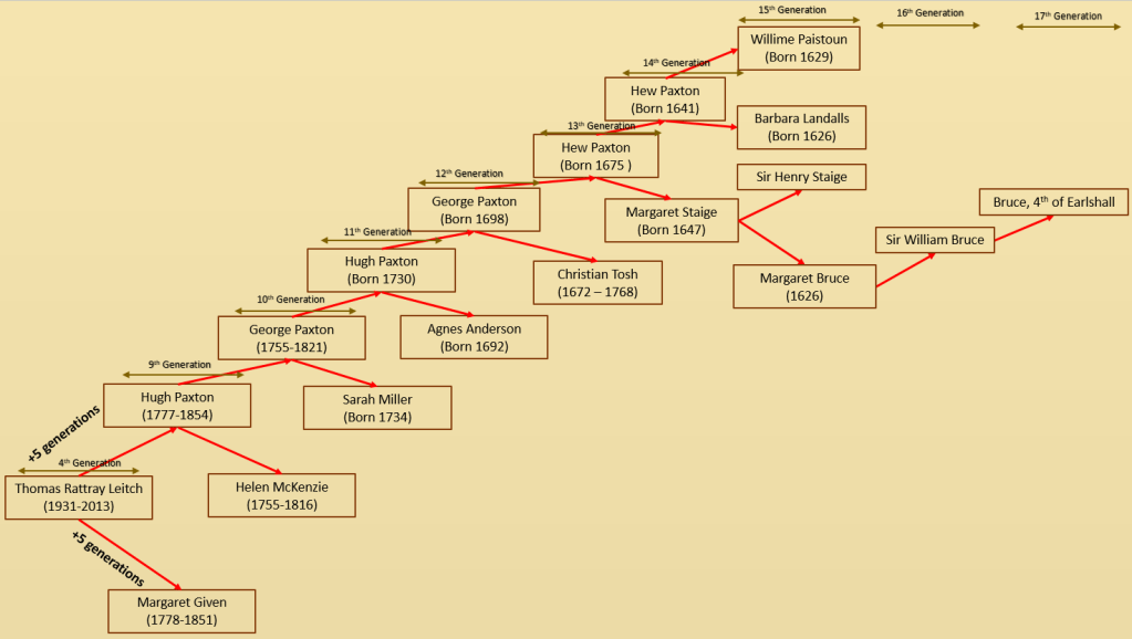 Hugh Paxton is my 5th times great grandfather, this has been confirmed through DNA testing. Hugh was an affluent man in Fife and I have a lot of information on him which has allowed me to research further back in history, his parents are the 10th Generation of this line of my story.